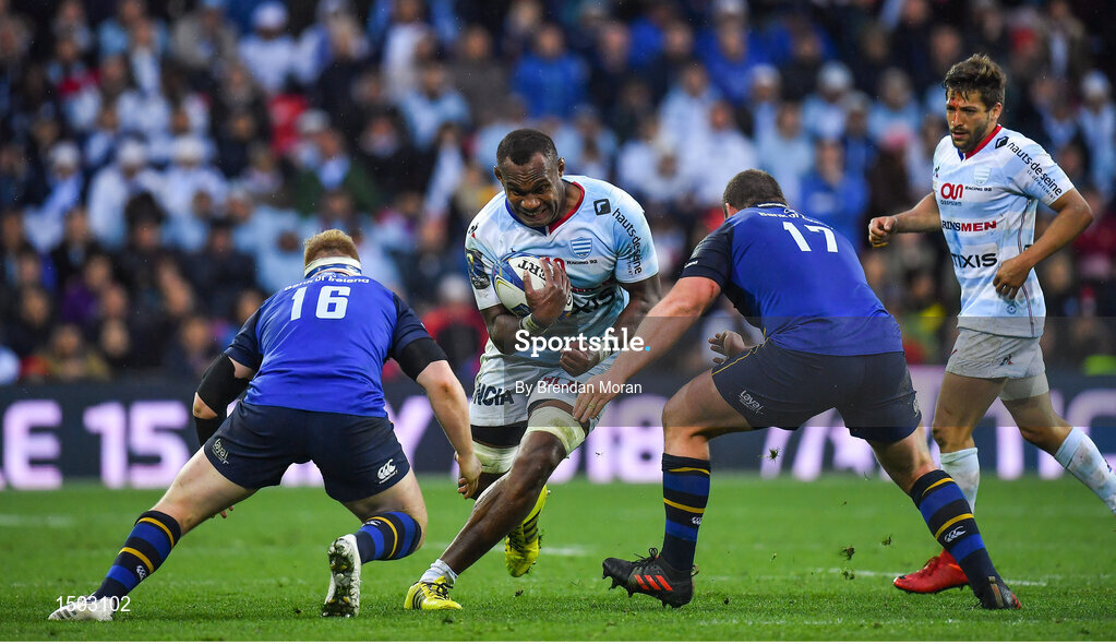 12 May 2018; Leone Nakawara of Racing 92 is tackled by James Tracy and Jack McGrath of Leinster during the European Rugby Champions Cup Final match between Leinster and Racing 92 at the San Mames Stadium in Bilbao, Spain. Photo by Brendan Moran/Sportsfile