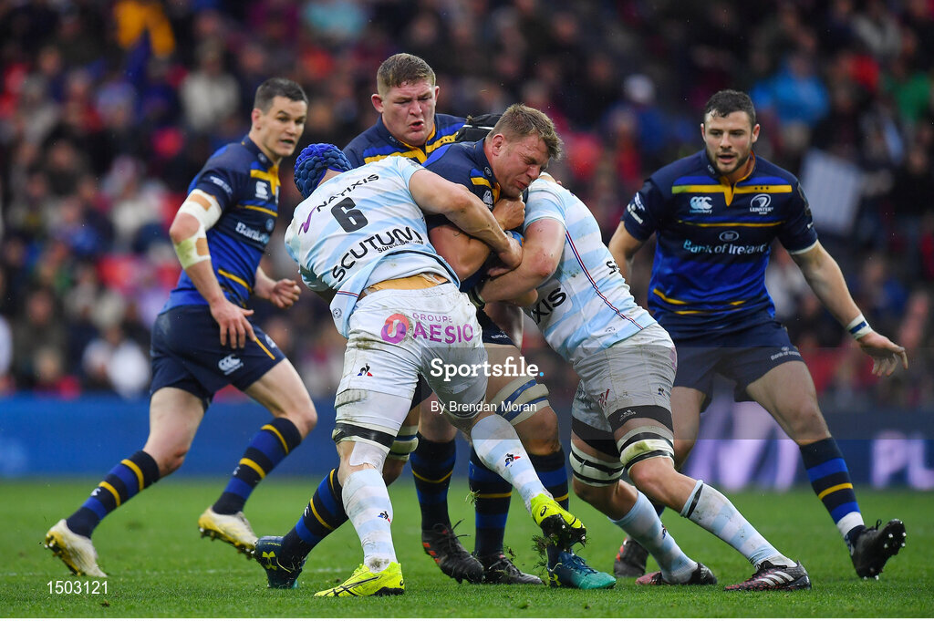 12 May 2018; Jordi Murphy of Leinster is tackled by Wenceslas Lauret and Bernard Le Roux of Racing 92 during the European Rugby Champions Cup Final match between Leinster and Racing 92 at the San Mames Stadium in Bilbao, Spain. Photo by Brendan Moran/Sportsfile