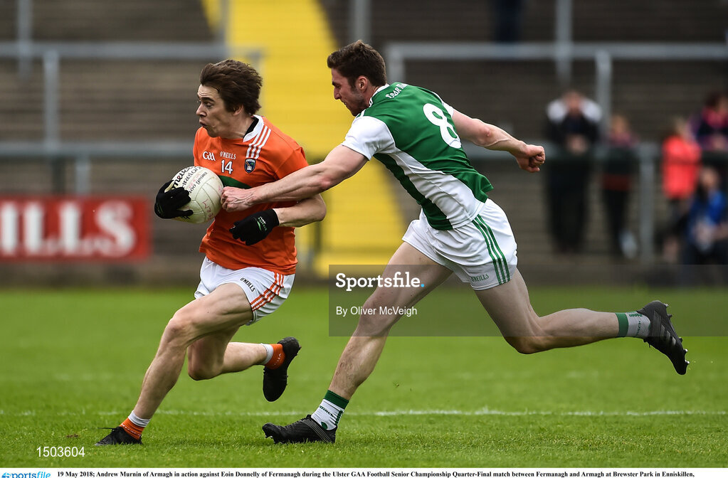 19 May 2018; Andrew Murnin of Armagh in action against Eoin Donnelly of Fermanagh during the Ulster GAA Football Senior Championship Quarter-Final match between Fermanagh and Armagh at Brewster Park in Enniskillen, Fermanagh. Photo by Oliver McVeigh/Sportsfile