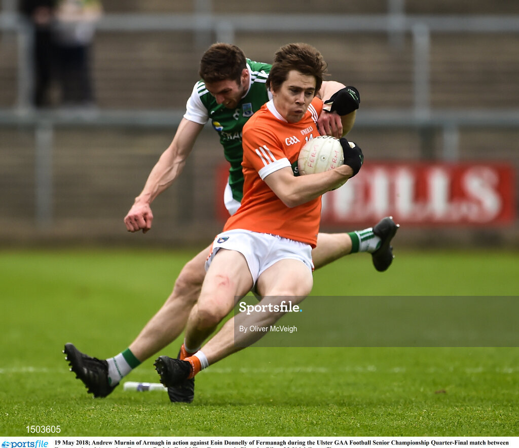 19 May 2018; Andrew Murnin of Armagh in action against Eoin Donnelly of Fermanagh during the Ulster GAA Football Senior Championship Quarter-Final match between Fermanagh and Armagh at Brewster Park in Enniskillen, Fermanagh. Photo by Oliver McVeigh/Sportsfile