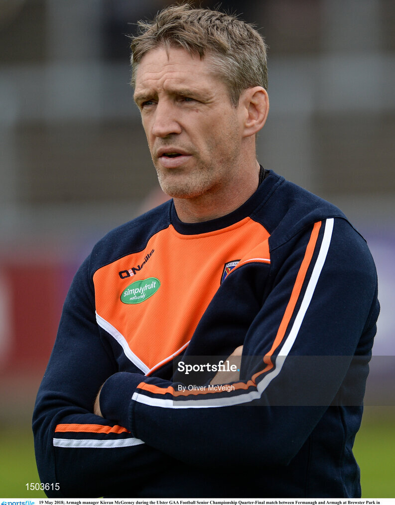 19 May 2018; Armagh manager Kieran McGeeney during the Ulster GAA Football Senior Championship Quarter-Final match between Fermanagh and Armagh at Brewster Park in Enniskillen, Fermanagh. Photo by Oliver McVeigh/Sportsfile