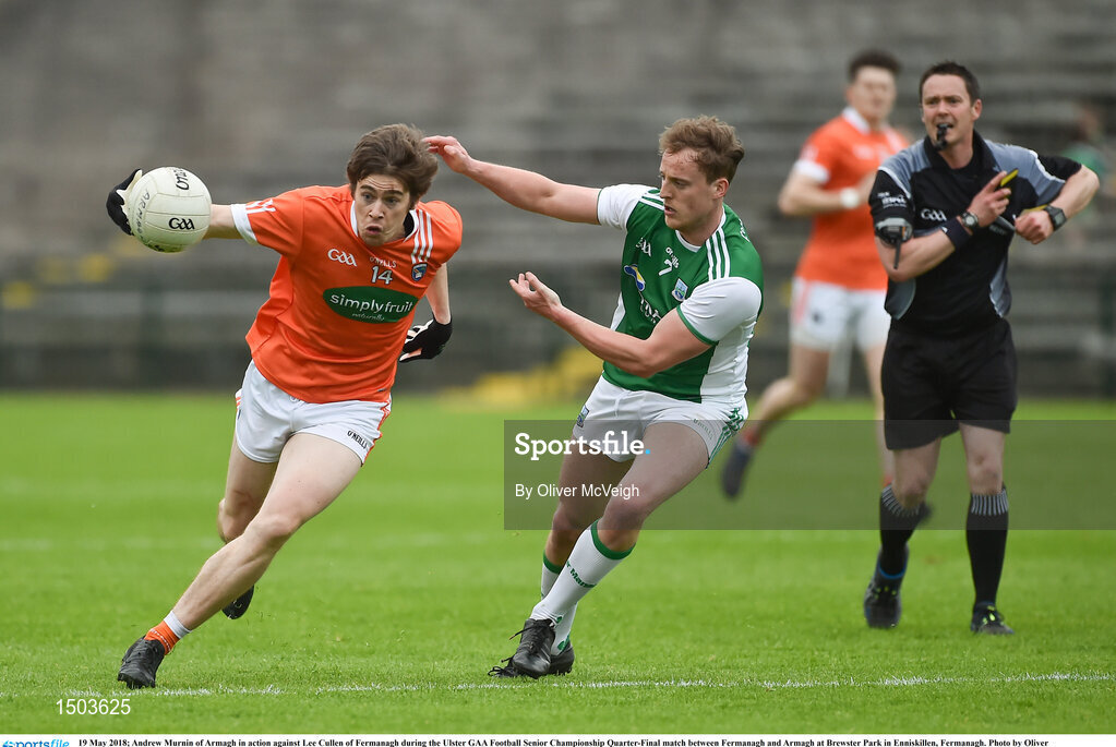 19 May 2018; Andrew Murnin of Armagh in action against Lee Cullen of Fermanagh during the Ulster GAA Football Senior Championship Quarter-Final match between Fermanagh and Armagh at Brewster Park in Enniskillen, Fermanagh. Photo by Oliver McVeigh/Sportsfile