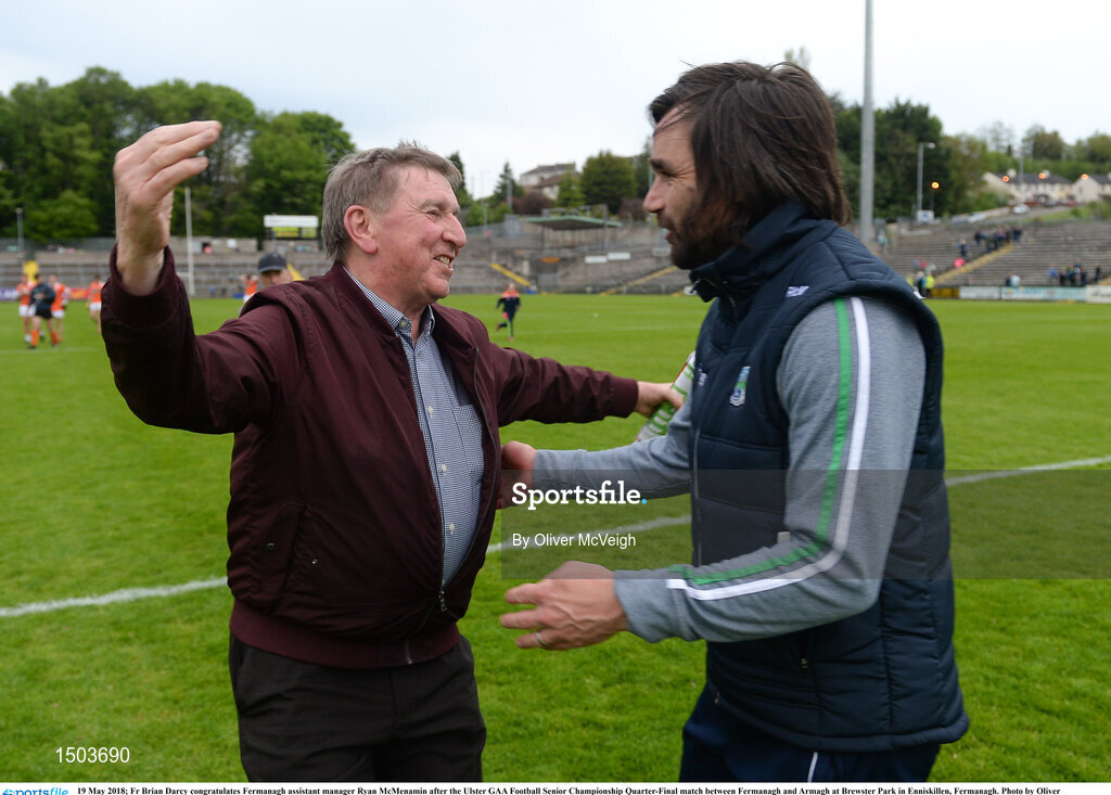 19 May 2018; Fr Brian Darcy congratulates Fermanagh assistant manager Ryan McMenamin after the Ulster GAA Football Senior Championship Quarter-Final match between Fermanagh and Armagh at Brewster Park in Enniskillen, Fermanagh. Photo by Oliver McVeigh/Sportsfile