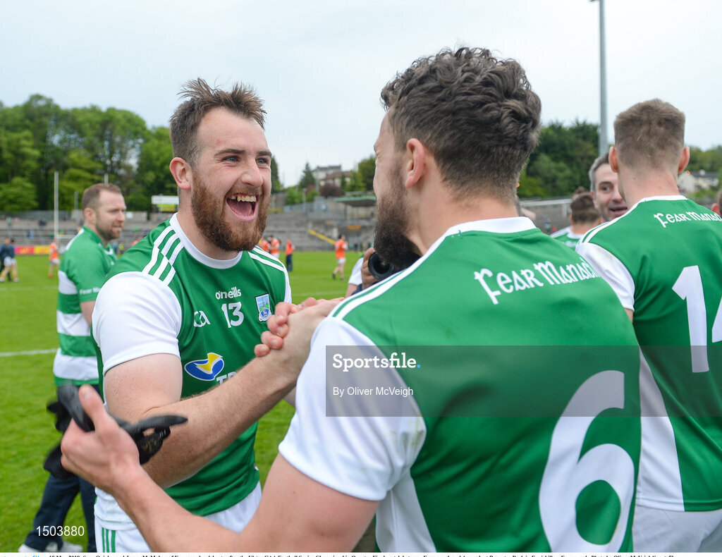 19 May 2018; Sean Quigley and James McMahon of Fermanagh celebrate after the Ulster GAA Football Senior Championship Quarter-Final match between Fermanagh and Armagh at Brewster Park in Enniskillen, Fermanagh. Photo by Oliver McVeigh/Sportsfile