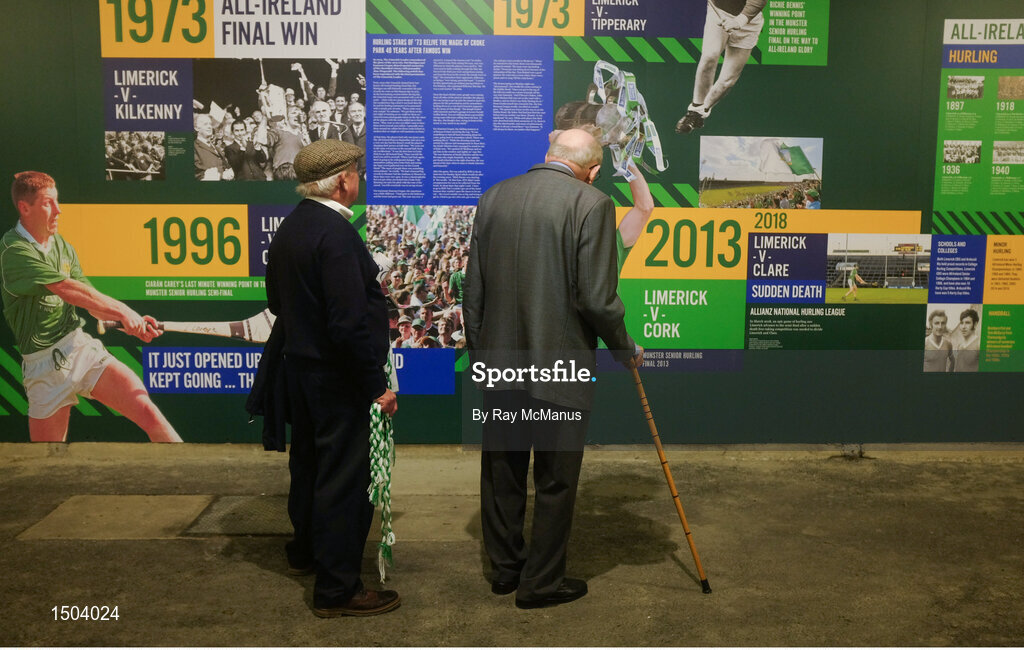 20 May 2018; Fr Seamus Ryan, Cappamore, Co Limerick, right, and his friend Dan Kennelly, Lixnaw, Co Kerry, review a new wall of pictures and historical facts prior to the Munster GAA Hurling Senior Championship Round 1 match between Limerick and Tipperary at the Gaelic Grounds in Limerick. Photo by Ray McManus/Sportsfile