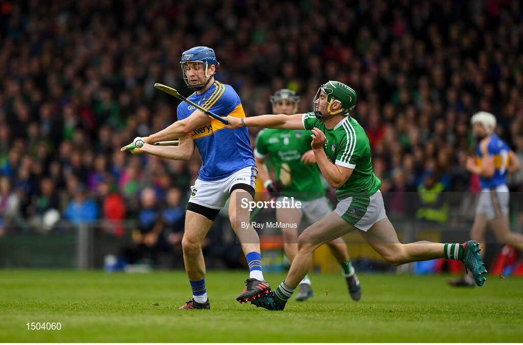 20 May 2018; Sean Finn of Limerick dives in to block a shot by John McGrath of Tipperary during the Munster GAA Hurling Senior Championship Round 1 match between Limerick and Tipperary at the Gaelic Grounds in Limerick. Photo by Ray McManus/Sportsfile