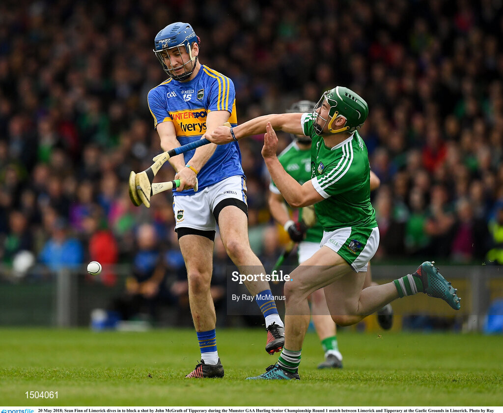 20 May 2018; Sean Finn of Limerick dives in to block a shot by John McGrath of Tipperary during the Munster GAA Hurling Senior Championship Round 1 match between Limerick and Tipperary at the Gaelic Grounds in Limerick. Photo by Ray McManus/Sportsfile