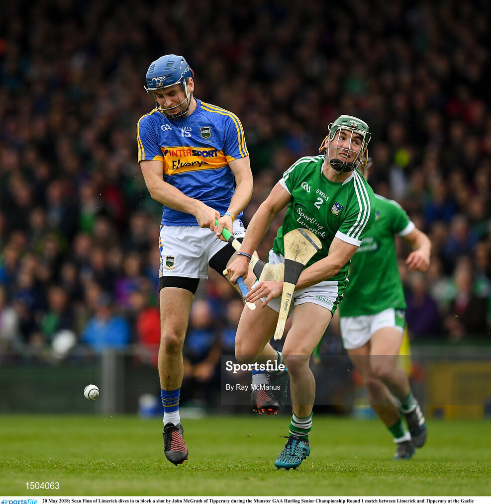 20 May 2018; Sean Finn of Limerick dives in to block a shot by John McGrath of Tipperary during the Munster GAA Hurling Senior Championship Round 1 match between Limerick and Tipperary at the Gaelic Grounds in Limerick. Photo by Ray McManus/Sportsfile