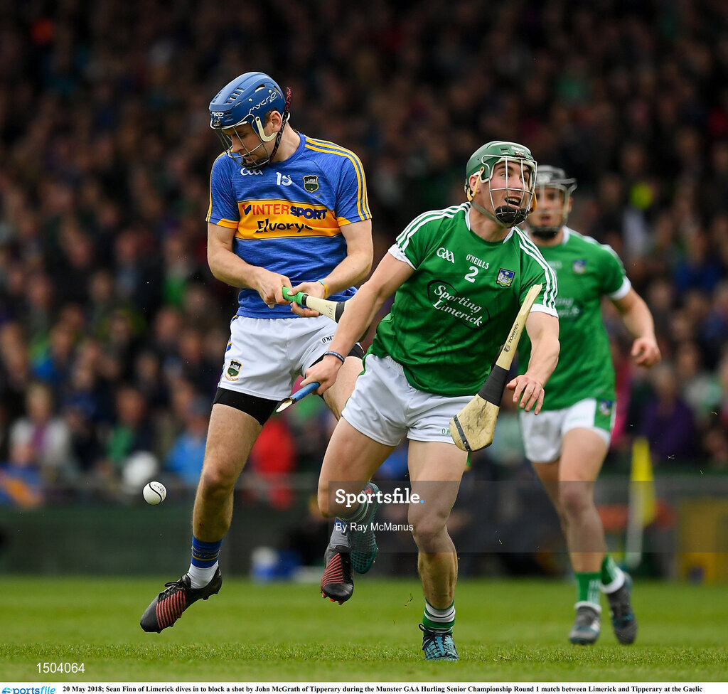 20 May 2018; Sean Finn of Limerick dives in to block a shot by John McGrath of Tipperary during the Munster GAA Hurling Senior Championship Round 1 match between Limerick and Tipperary at the Gaelic Grounds in Limerick. Photo by Ray McManus/Sportsfile