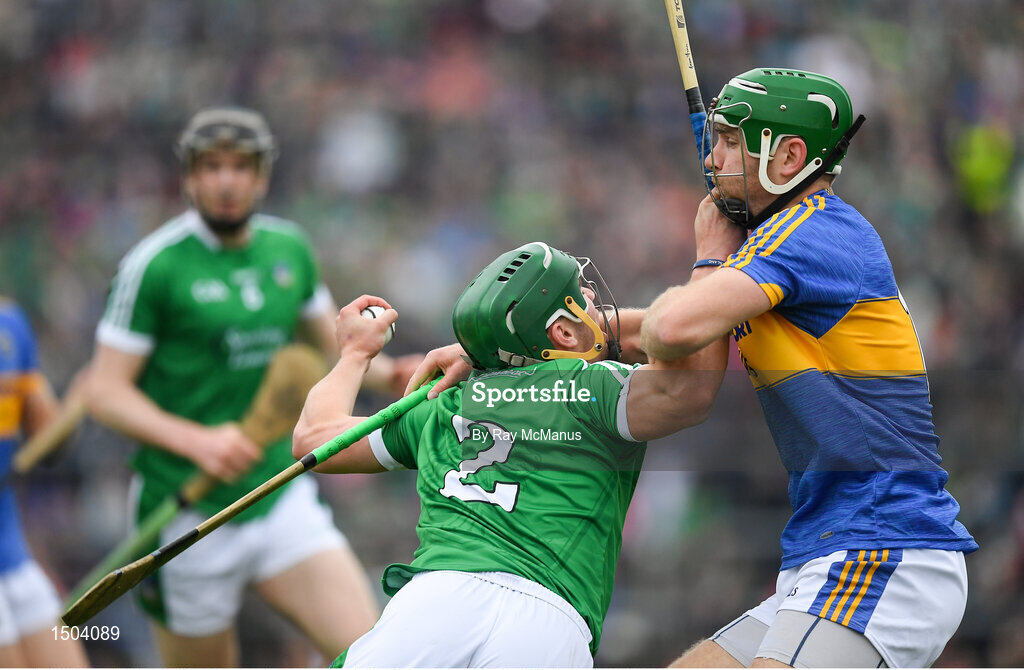 20 May 2018; Sean Finn of Limerick is tackled by Noel McGrath of Tipperary during the Munster GAA Hurling Senior Championship Round 1 match between Limerick and Tipperary at the Gaelic Grounds in Limerick. Photo by Ray McManus/Sportsfile