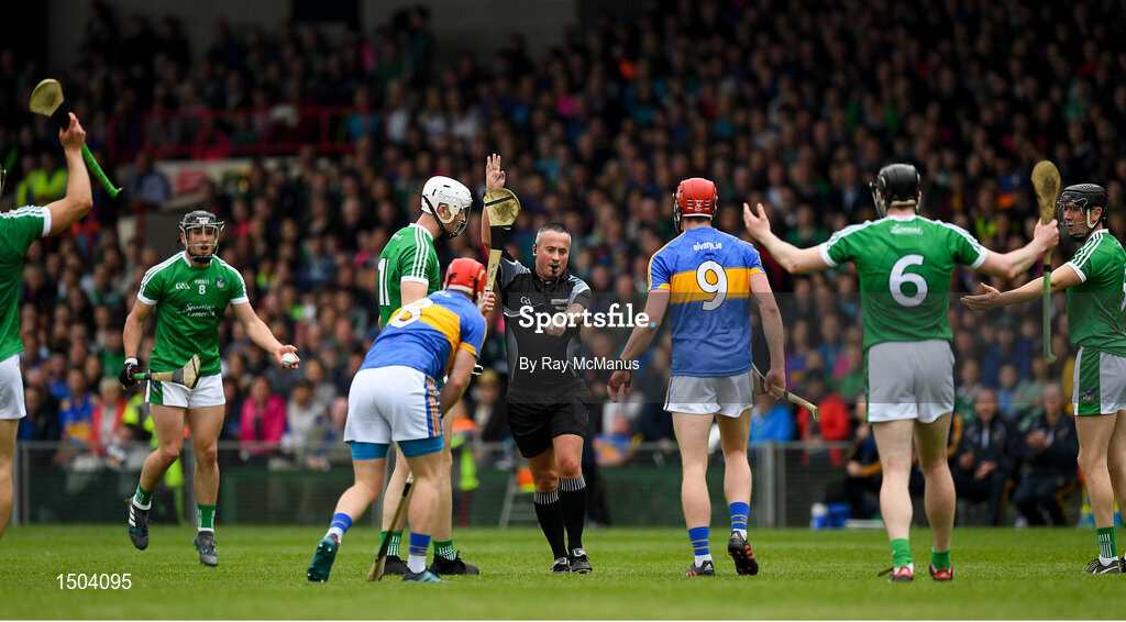 20 May 2018; Referee James McGrath indicates a free during the Munster GAA Hurling Senior Championship Round 1 match between Limerick and Tipperary at the Gaelic Grounds in Limerick. Photo by Ray McManus/Sportsfile