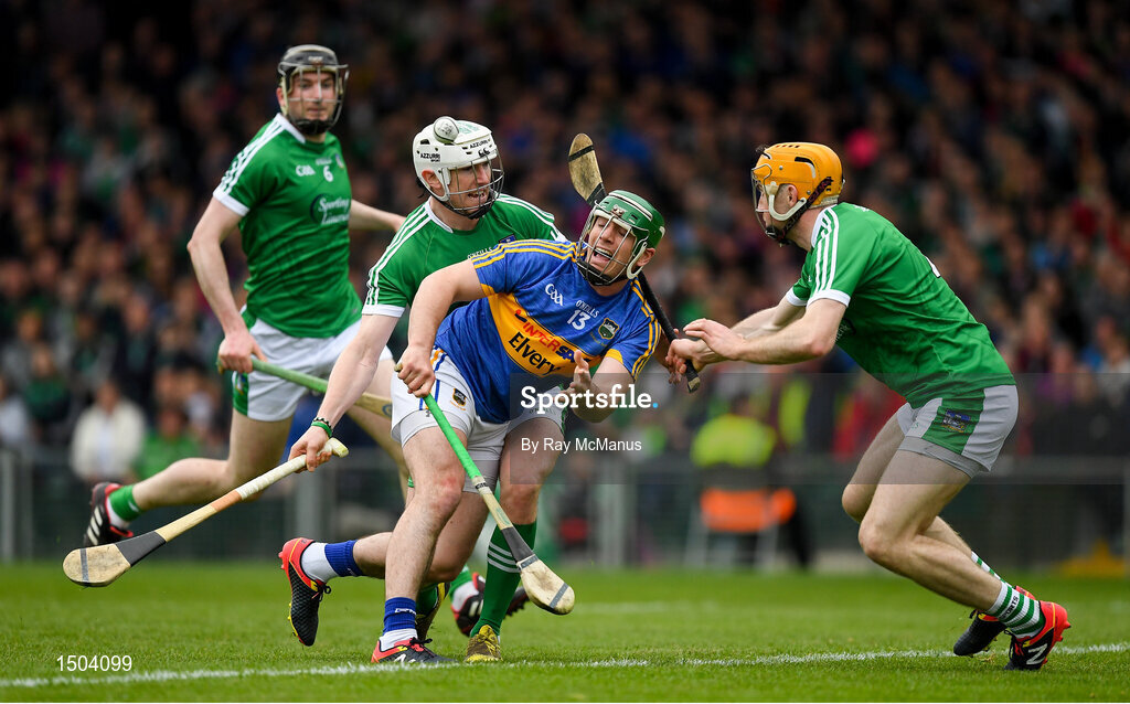 20 May 2018; John O'Dwyer of Tipperary hand passes under pressure from Limerick defenders Seamus Hickey, 3, and Richie English during the Munster GAA Hurling Senior Championship Round 1 match between Limerick and Tipperary at the Gaelic Grounds in Limerick. Photo by Ray McManus/Sportsfile