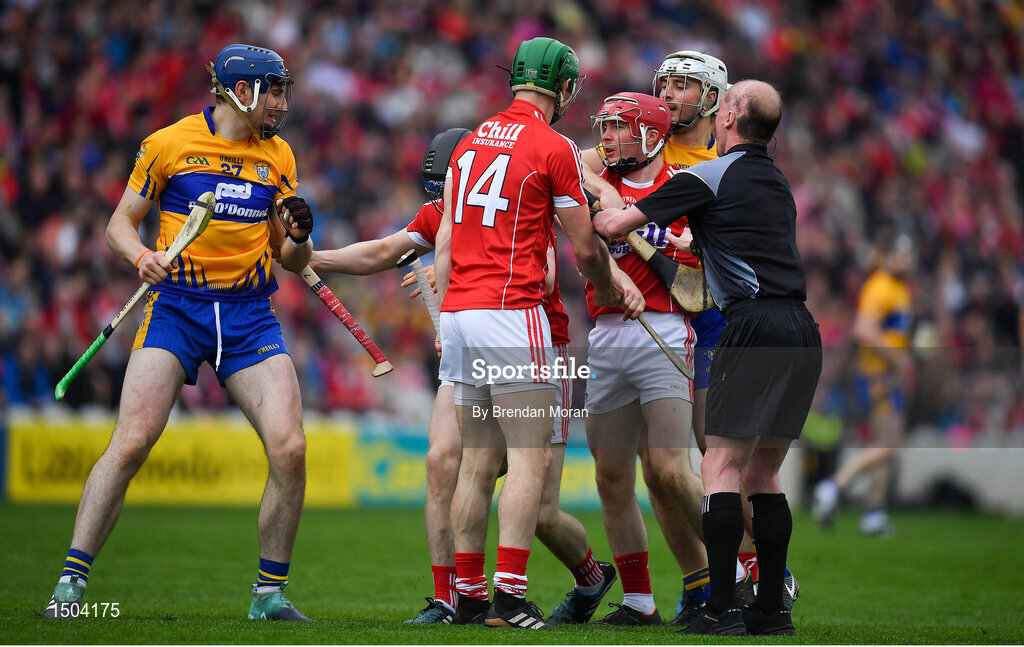 20 May 2018; Referee Sean Cleere attempts to seperate players from both sides during the Munster GAA Hurling Senior Championship Round 1 match between Cork and Clare at Páirc Uí Chaoimh in Cork. Photo by Brendan Moran/Sportsfile