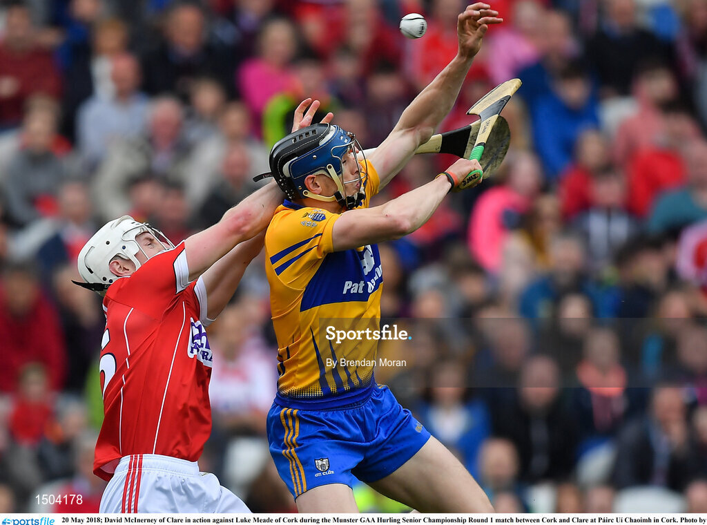 20 May 2018; David McInerney of Clare in action against Luke Meade of Cork during the Munster GAA Hurling Senior Championship Round 1 match between Cork and Clare at Páirc Uí Chaoimh in Cork. Photo by Brendan Moran/Sportsfile
