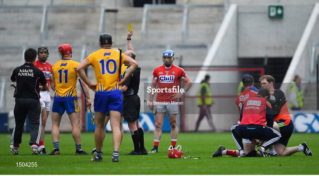 20 May 2018; John Conlon of Clare is shown a yellow card by referee Sean Cleere after a clash with Daniel Kearney of Cork during the Munster GAA Hurling Senior Championship Round 1 match between Cork and Clare at Páirc Uí Chaoimh in Cork. Photo by Brendan Moran/Sportsfile