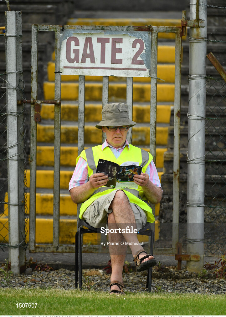 26 May 2018; Steward Walter Sharpley, from Seán O'Heslins GAA, Ballinamore, Co Leitrim, reads the match programme before the Connacht GAA Football Senior Championship semi-final match between Leitrim and Roscommon at Páirc Seán Mac Diarmada in Carrick-on-Shannon, Leitrim. Photo by Piaras Ó Mídheach/Sportsfile