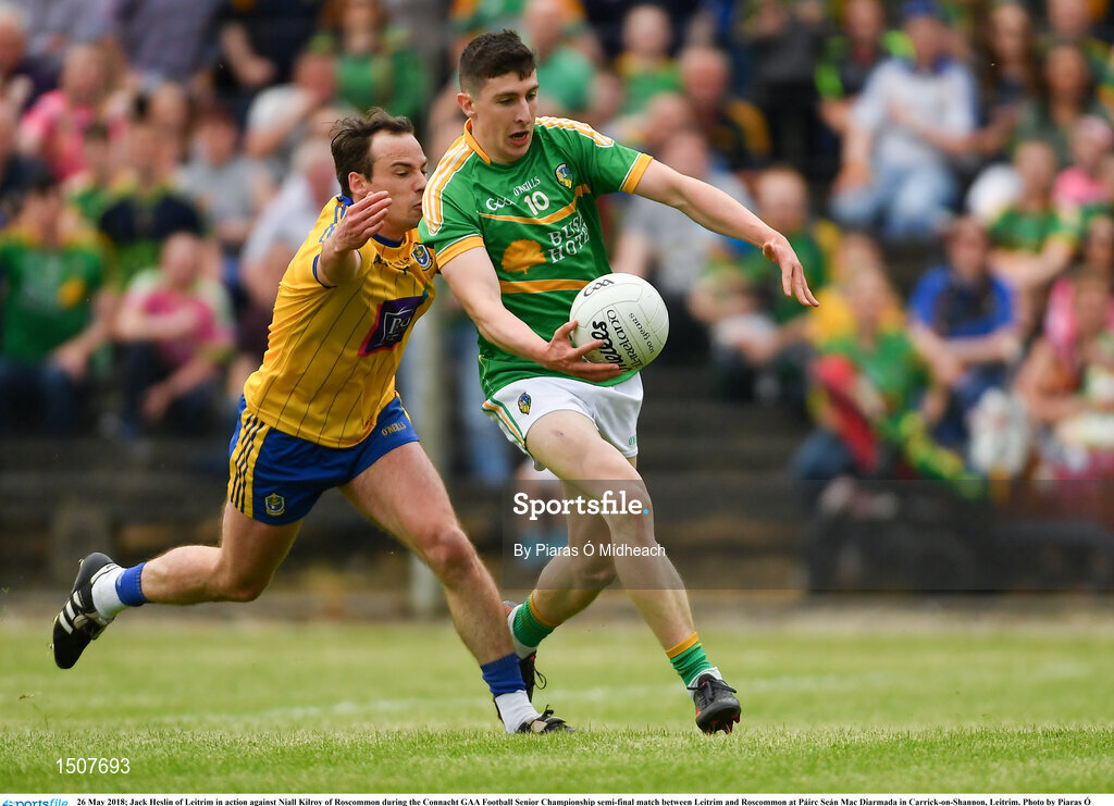 26 May 2018; Jack Heslin of Leitrim in action against Niall Kilroy of Roscommon during the Connacht GAA Football Senior Championship semi-final match between Leitrim and Roscommon at Páirc Seán Mac Diarmada in Carrick-on-Shannon, Leitrim. Photo by Piaras Ó Mídheach/Sportsfile