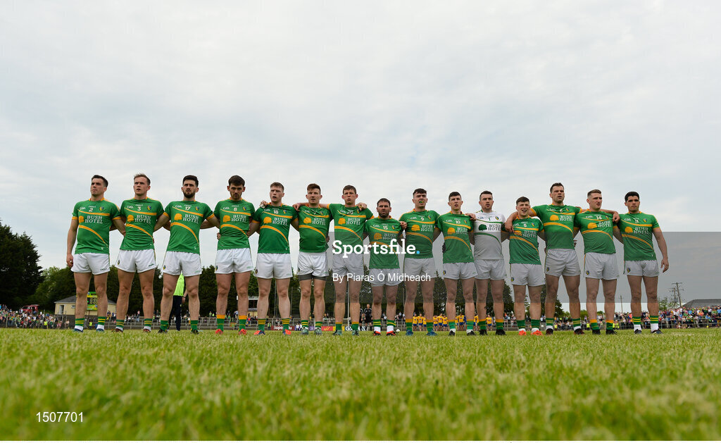 26 May 2018; Leitrim players stand for Amhrán na bhFiann before the Connacht GAA Football Senior Championship semi-final match between Leitrim and Roscommon at Páirc Seán Mac Diarmada in Carrick-on-Shannon, Leitrim. Photo by Piaras Ó Mídheach/Sportsfile