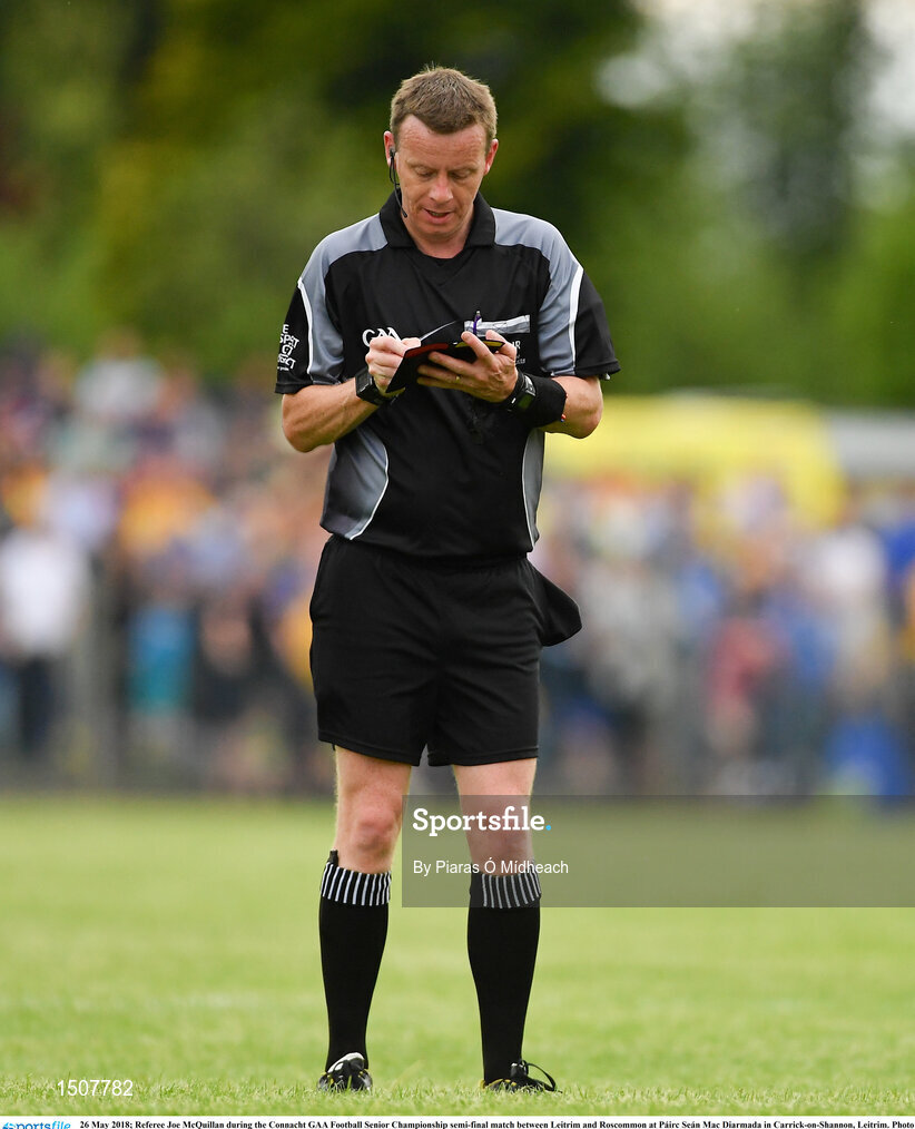 26 May 2018; Referee Joe McQuillan during the Connacht GAA Football Senior Championship semi-final match between Leitrim and Roscommon at Páirc Seán Mac Diarmada in Carrick-on-Shannon, Leitrim. Photo by Piaras Ó Mídheach/Sportsfile