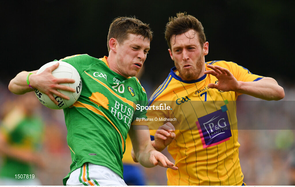 26 May 2018; Aidan Flynn of Leitrim in action against Conor Devaney of Roscommon during the Connacht GAA Football Senior Championship semi-final match between Leitrim and Roscommon at Páirc Seán Mac Diarmada in Carrick-on-Shannon, Leitrim. Photo by Piaras Ó Mídheach/Sportsfile