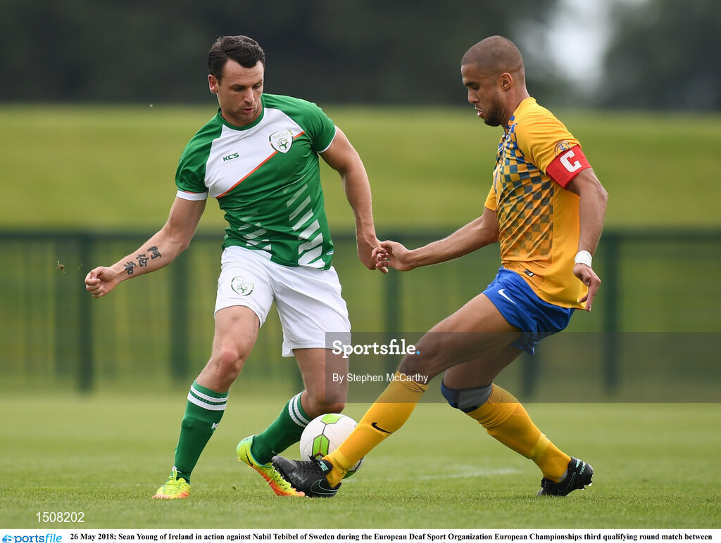 26 May 2018; Sean Young of Ireland in action against Nabil Tebibel of Sweden during the European Deaf Sport Organization European Championships third qualifying round match between Ireland and Sweden at the FAI National Training Centre in Abbotstown, Dublin. Photo by Stephen McCarthy/Sportsfile