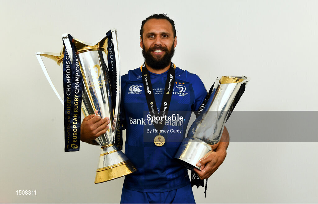 26 May 2018; Isa Nacewa poses for a portrait with the Champions Cup and the Guinness PRO14 Trophy, following the Guinness PRO14 Final match between Leinster and Scarlets at the Aviva Stadium in Dublin. Photo by Ramsey Cardy/Sportsfile