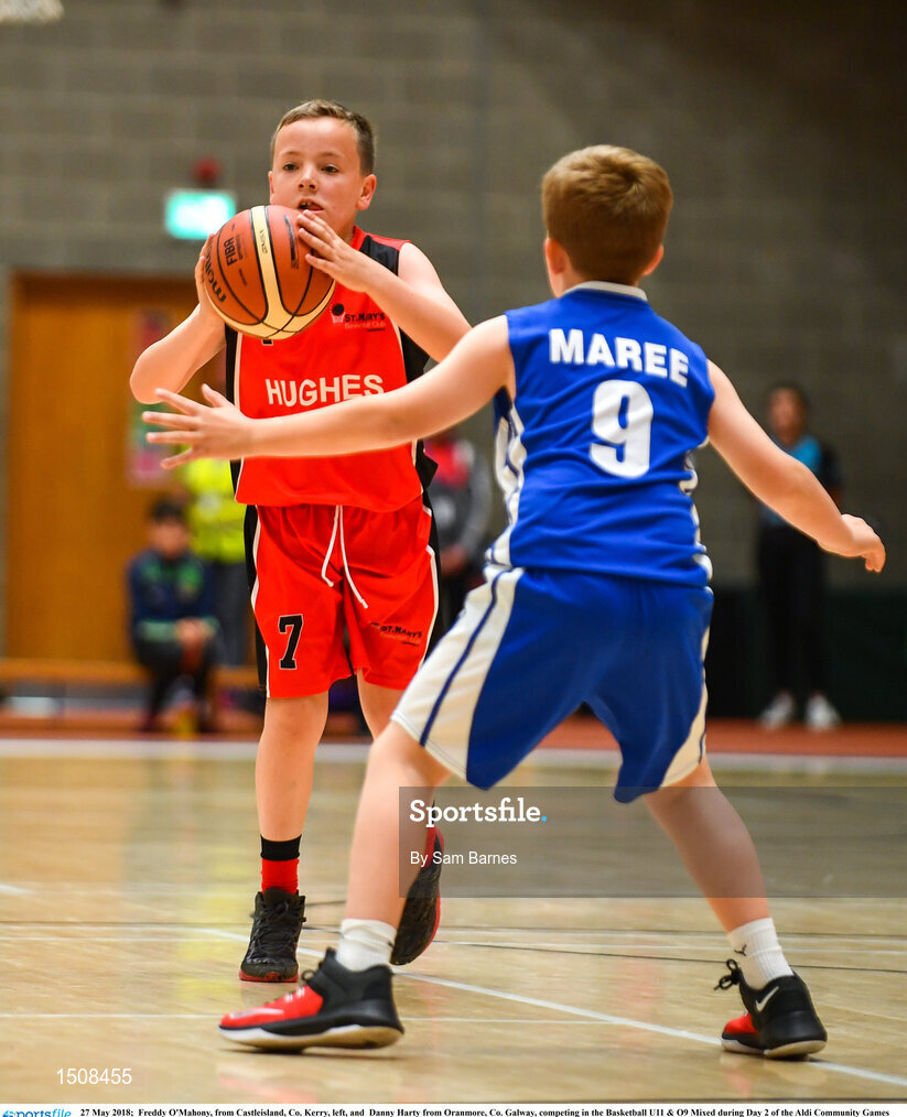 27 May 2018; Freddy O'Mahony, from Castleisland, Co. Kerry, left, and Danny Harty from Oranmore, Co. Galway, competing in the Basketball U11 & O9 Mixed during Day 2 of the Aldi Community Games May Festival, which saw over 3,500 children take part in a fun-filled weekend at University of Limerick from 26th to 27th May. Photo by Sam Barnes/Sportsfile
