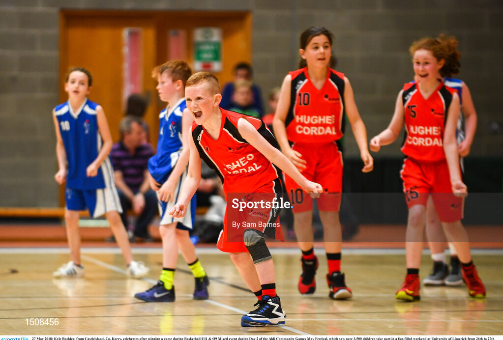 27 May 2018; Kyle Buckley, from Castleisland, Co. Kerry, celebrates after winning a game during Basketball U11 & O9 Mixed event during Day 2 of the Aldi Community Games May Festival, which saw over 3,500 children take part in a fun-filled weekend at University of Limerick from 26th to 27th May. Photo by Sam Barnes/Sportsfile