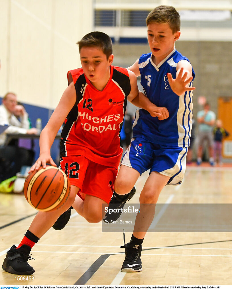 27 May 2018; Cillian O'Sullivan from Castleisland, Co. Kerry, left, and Jamie Egan from Oranmore, Co. Galway, competing in the Basketball U11 & O9 Mixed event during Day 2 of the Aldi Community Games May Festival, which saw over 3,500 children take part in a fun-filled weekend at University of Limerick from 26th to 27th May. Photo by Sam Barnes/Sportsfile