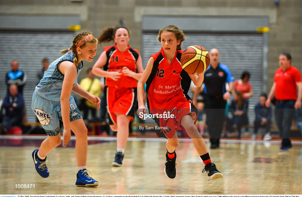 27 May 2018; Tara Kerin from Castleisland, Co. Kerry, right, and Naoise O'Brien from Oranmore, Co. Galway, competing in the Basketball U13 & O10 Girls during Day 2 of the Aldi Community Games May Festival, which saw over 3,500 children take part in a fun-filled weekend at University of Limerick from 26th to 27th May. Photo by Sam Barnes/Sportsfile