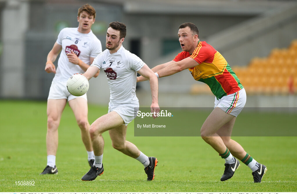 27 May 2018; Kevin Flynn of Kildare in action against Darragh Foley of Carlow during the Leinster GAA Football Senior Championship Quarter-Final match between Carlow and Kildare at O'Connor Park in Tullamore, Offaly. Photo by Matt Browne/Sportsfile