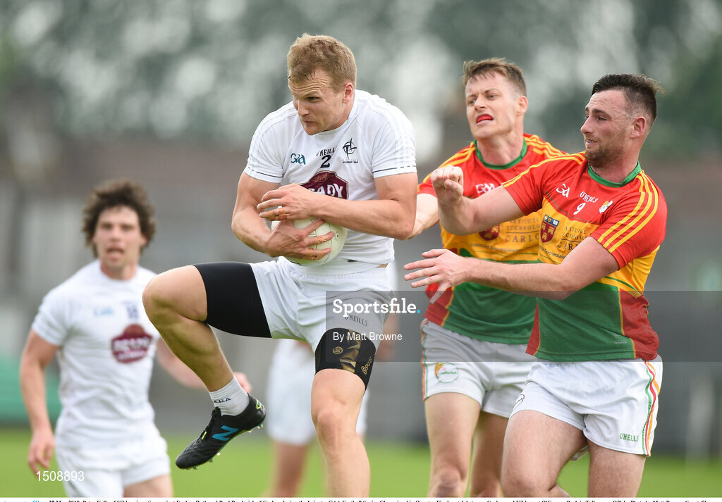 27 May 2018; Peter Kelly of Kildare in action against Eoghan Ruth and Paul Broderick of Carlow during the Leinster GAA Football Senior Championship Quarter-Final match between Carlow and Kildare at O'Connor Park in Tullamore, Offaly. Photo by Matt Browne/Sportsfile