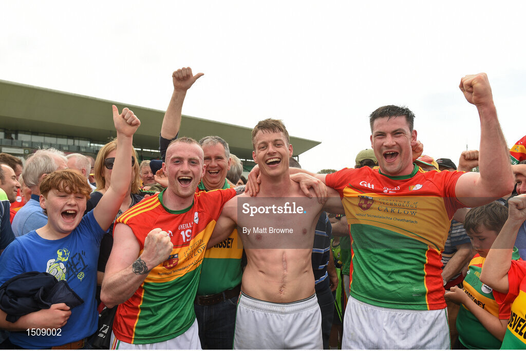 27 May 2018; Carlow players from left Cian Lawler, Paul Broderick and team captain John Murphy celebrate after the Leinster GAA Football Senior Championship Quarter-Final match between Carlow and Kildare at O'Connor Park in Tullamore, Offaly. Photo by Matt Browne/Sportsfile