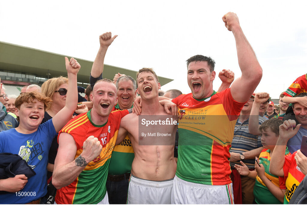 27 May 2018; Carlow players from left Cian Lawler, Paul Broderick and team captain John Murphy celebrate after the Leinster GAA Football Senior Championship Quarter-Final match between Carlow and Kildare at O'Connor Park in Tullamore, Offaly. Photo by Matt Browne/Sportsfile