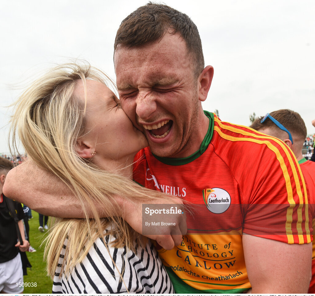 27 May 2018; Darragh Foley of Carlow celebrates with his girlfriend Shona Delaney after the Leinster GAA Football Senior Championship Quarter-Final match between Carlow and Kildare at O'Connor Park in Tullamore, Offaly. Photo by Matt Browne/Sportsfile