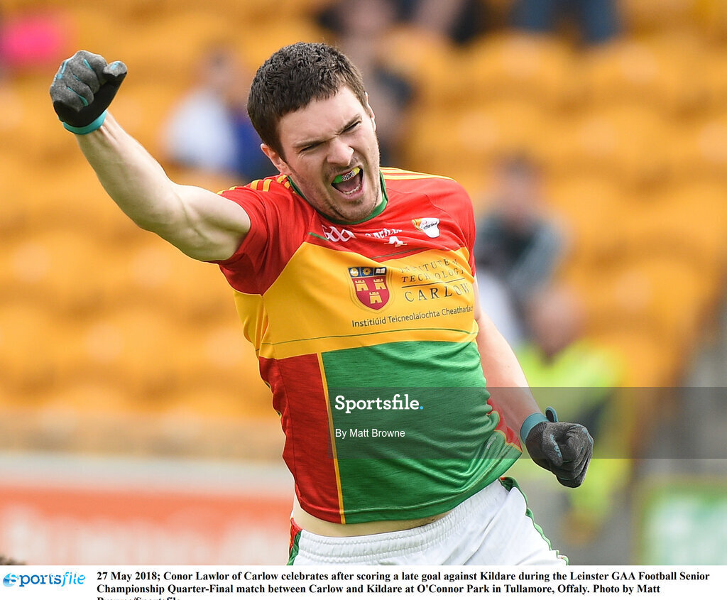 27 May 2018; Conor Lawlor of Carlow celebrates after scoring a late goal during the Leinster GAA Football Senior Championship Quarter-Final match between Carlow and Kildare at O'Connor Park in Tullamore, Offaly. Photo by Matt Browne/Sportsfile
