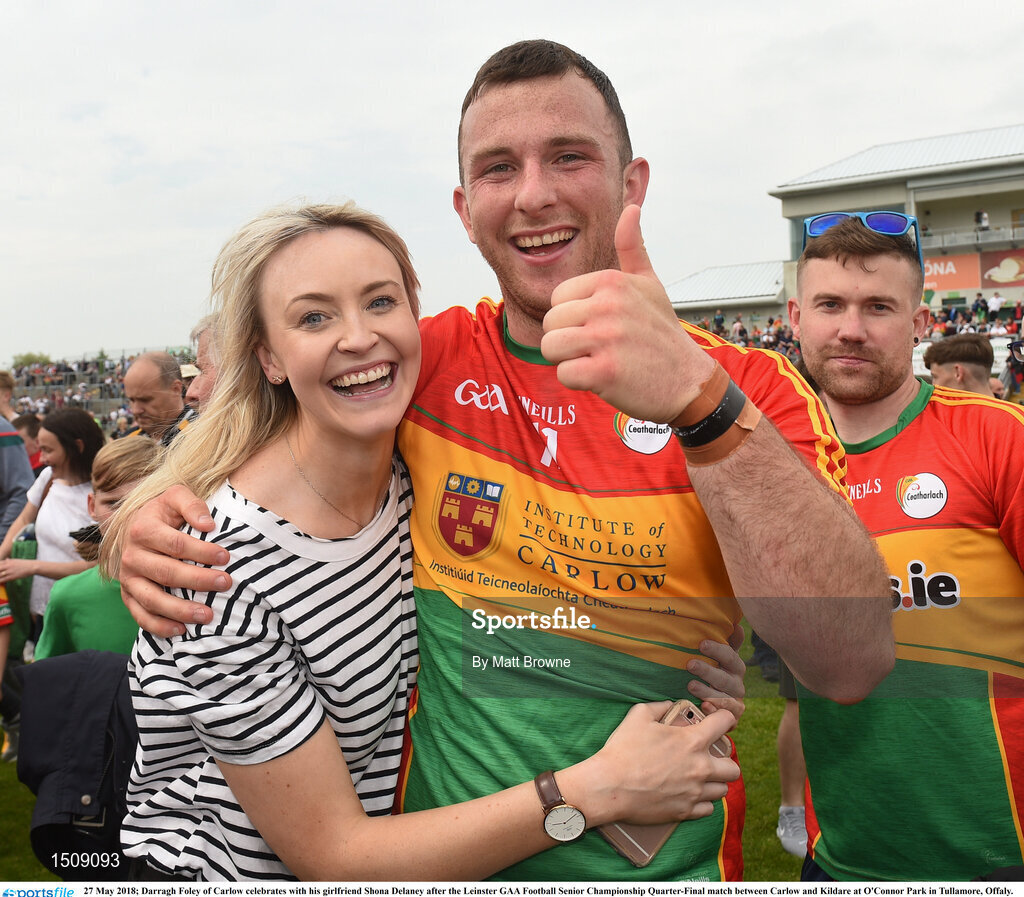 27 May 2018; Darragh Foley of Carlow celebrates with his girlfriend Shona Delaney after the Leinster GAA Football Senior Championship Quarter-Final match between Carlow and Kildare at O'Connor Park in Tullamore, Offaly. Photo by Matt Browne/Sportsfile