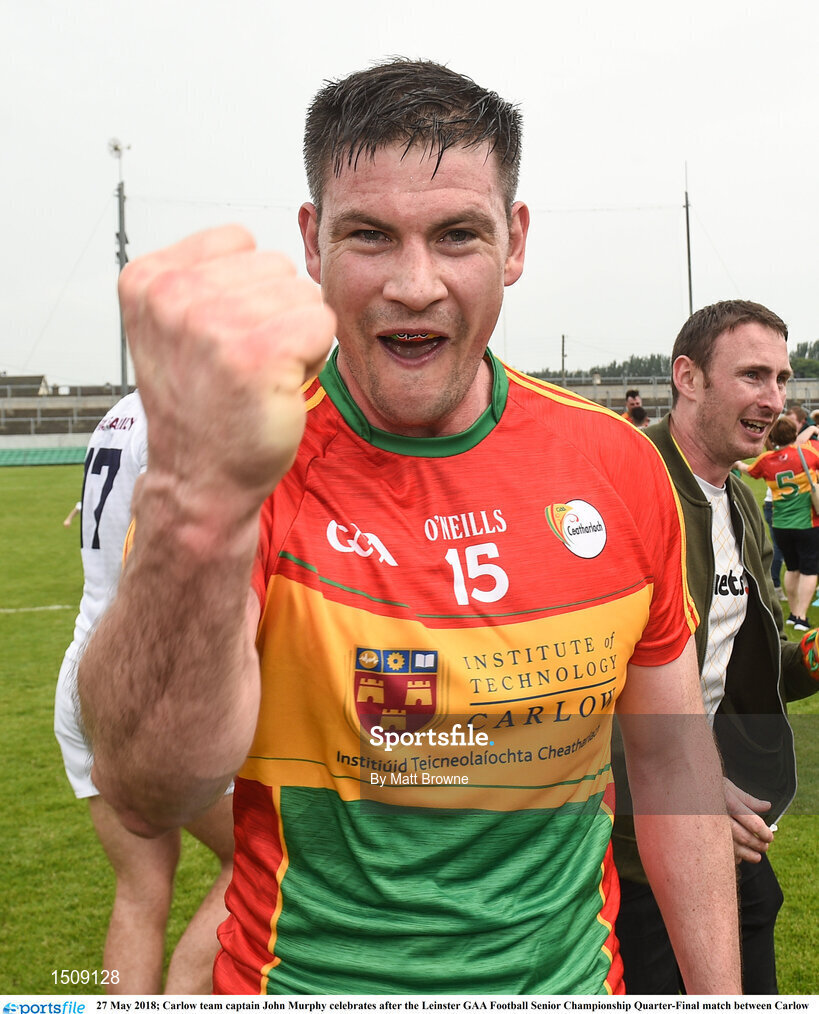 27 May 2018; Carlow team captain John Murphy celebrates after the Leinster GAA Football Senior Championship Quarter-Final match between Carlow and Kildare at O'Connor Park in Tullamore, Offaly. Photo by Matt Browne/Sportsfile