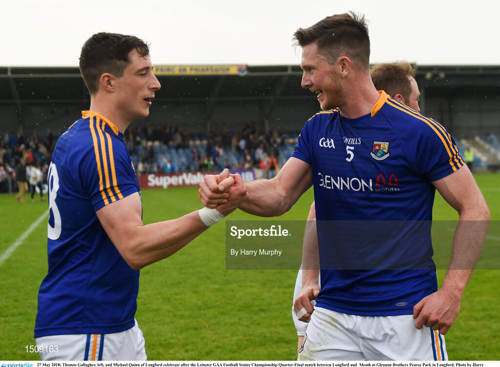 27 May 2018; Thomas Gallagher, left, and Michael Quinn of Longford celebrate after the Leinster GAA Football Senior Championship Quarter-Final match between Longford and Meath at Glennon Brothers Pearse Park in Longford. Photo by Harry Murphy/Sportsfile