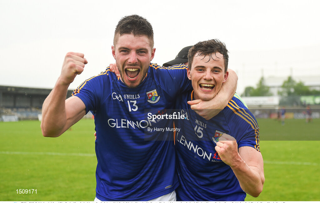 27 May 2018; Robbie Smyth, left, and Rian Brady of Longford celebrate after the Leinster GAA Football Senior Championship Quarter-Final match between Longford and Meath at Glennon Brothers Pearse Park in Longford. Photo by Harry Murphy/Sportsfile