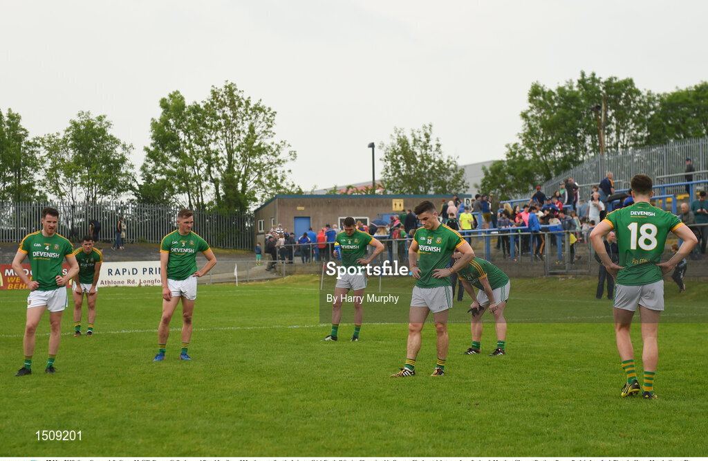27 May 2018; Sean Curran, left, Conor McGill, Darren Gallagher and Donal Lenihan of Meath react after the Leinster GAA Football Senior Championship Quarter-Final match between Longford and Meath at Glennon Brothers Pearse Park in Longford. Photo by Harry Murphy/Sportsfile