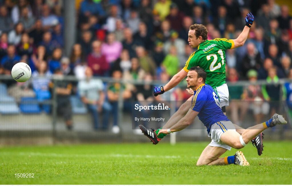 27 May 2018; Eamon Wallace of Meath shoots at goal under pressure from Donal McElligott of Longford during the Leinster GAA Football Senior Championship Quarter-Final match between Longford and Meath at Glennon Brothers Pearse Park in Longford. Photo by Harry Murphy/Sportsfile