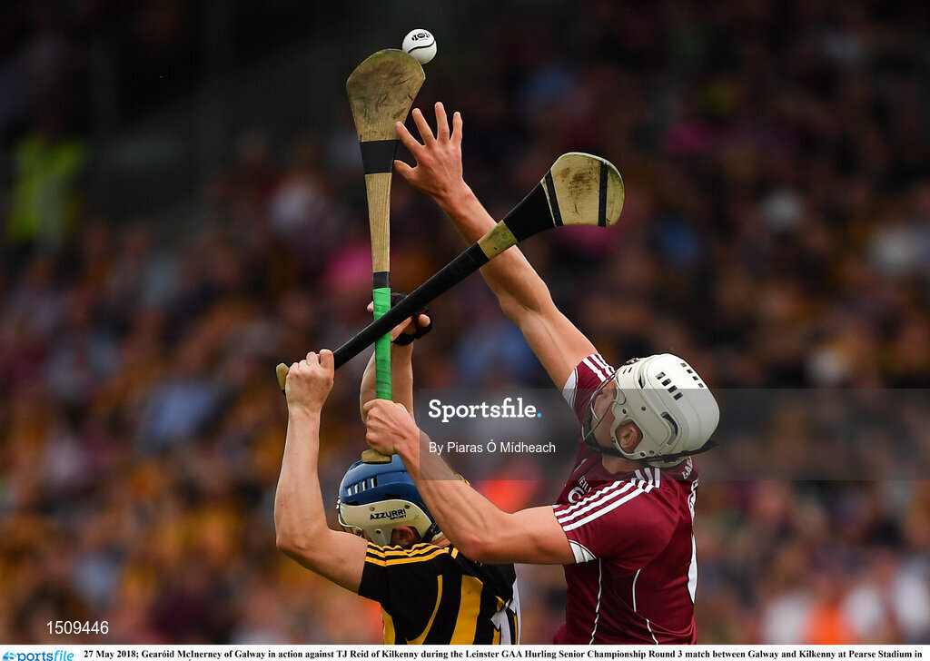 27 May 2018; Gearóid McInerney of Galway in action against TJ Reid of Kilkenny during the Leinster GAA Hurling Senior Championship Round 3 match between Galway and Kilkenny at Pearse Stadium in Galway. Photo by Piaras Ó Mídheach/Sportsfile