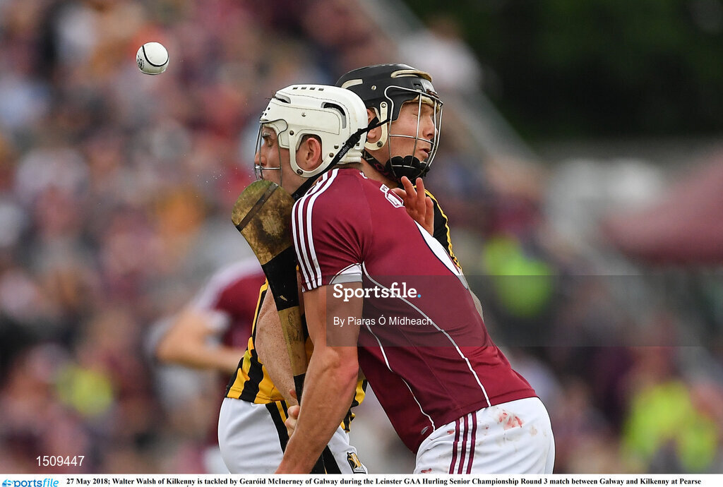 27 May 2018; Walter Walsh of Kilkenny is tackled by Gearóid McInerney of Galway during the Leinster GAA Hurling Senior Championship Round 3 match between Galway and Kilkenny at Pearse Stadium in Galway. Photo by Piaras Ó Mídheach/Sportsfile