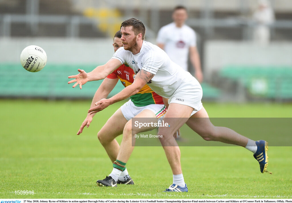27 May 2018; Johnny Byrne of Kildare in action against Darragh Foley of Carlow during the Leinster GAA Football Senior Championship Quarter-Final match between Carlow and Kildare at O'Connor Park in Tullamore, Offaly. Photo by Matt Browne/Sportsfile