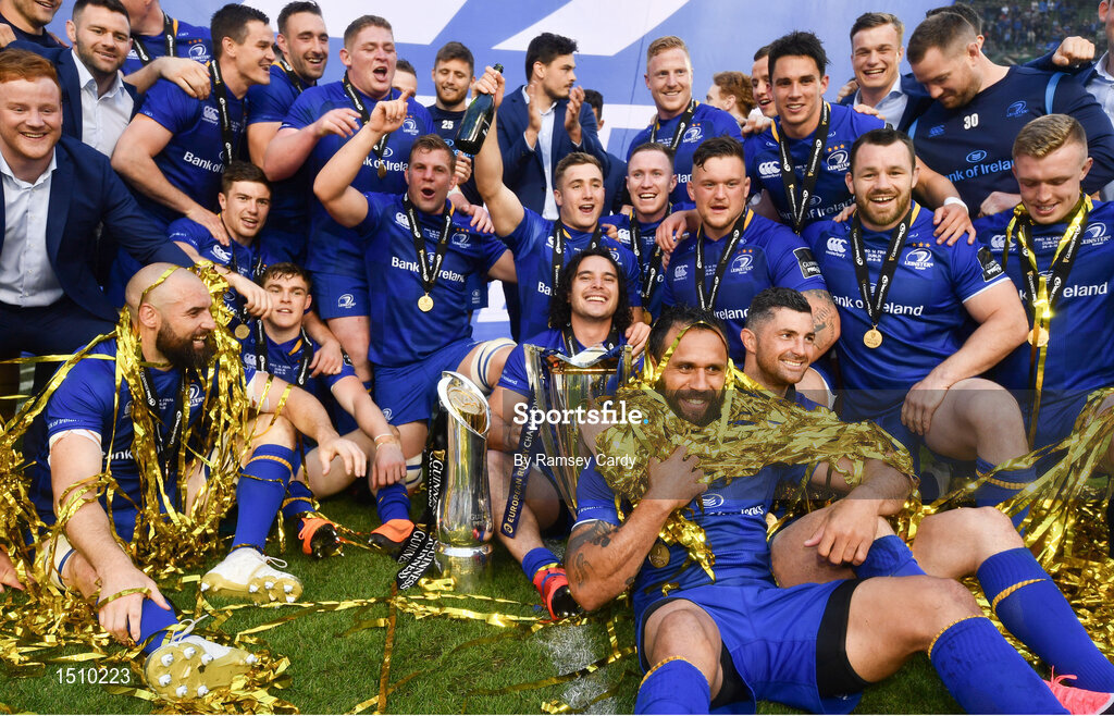 26 May 2018; The Leinster team celebrate with the Champions Cup and PRO14 trophies following their victory in the Guinness PRO14 Final between Leinster and Scarlets at the Aviva Stadium in Dublin. Photo by Ramsey Cardy/Sportsfile