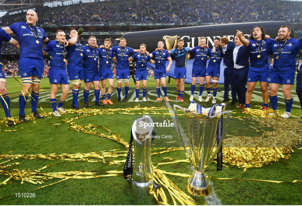 26 May 2018; The Leinster team celebrate with the Champions Cup and PRO14 trophies following their victory in the Guinness PRO14 Final between Leinster and Scarlets at the Aviva Stadium in Dublin. Photo by Ramsey Cardy/Sportsfile