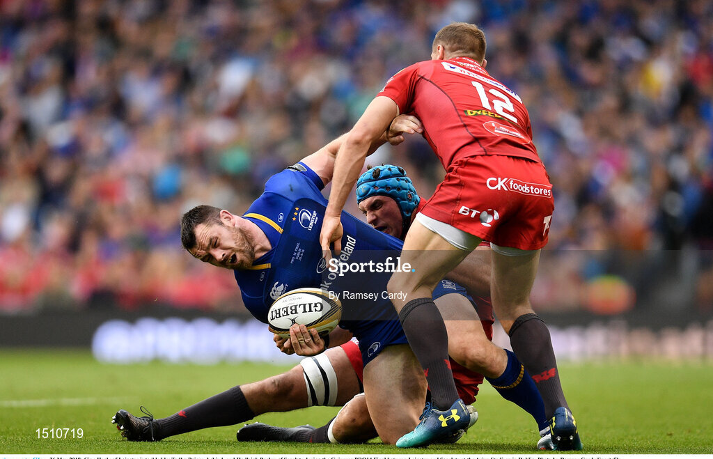 26 May 2018; Cian Healy of Leinster is tackled by Tadhg Beirne, behind, and Hadleigh Parkes of Scarlets during the Guinness PRO14 Final between Leinster and Scarlets at the Aviva Stadium in Dublin. Photo by Ramsey Cardy/Sportsfile