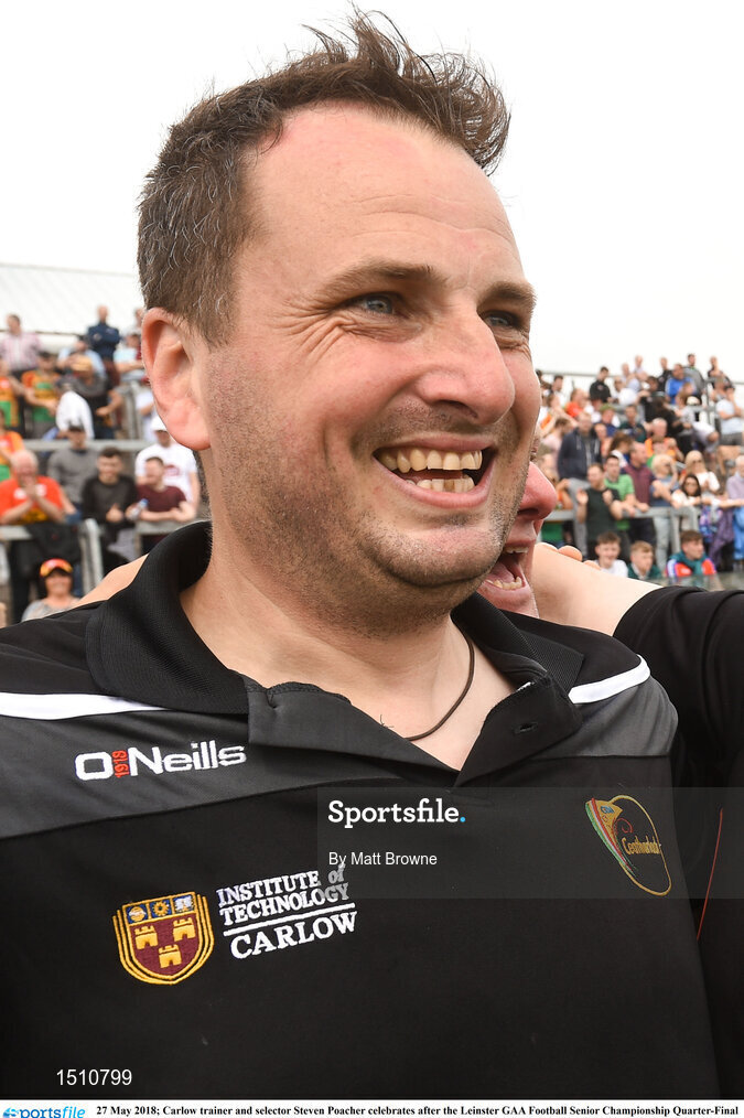 27 May 2018; Carlow trainer and selector Steven Poacher celebrates after the Leinster GAA Football Senior Championship Quarter-Final match between Carlow and Kildare at O'Connor Park in Tullamore, Offaly. Photo by Matt Browne/Sportsfile