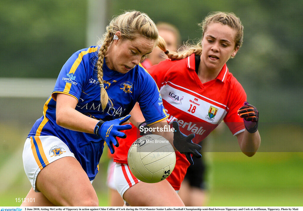 2 June 2018; Aisling McCarthy of Tipperary in action against Chloe Collins of Cork during the TG4 Munster Senior Ladies Football Championship semi-final between Tipperary and Cork at Ardfinnan, Tipperary. Photo by Matt Browne/Sportsfile